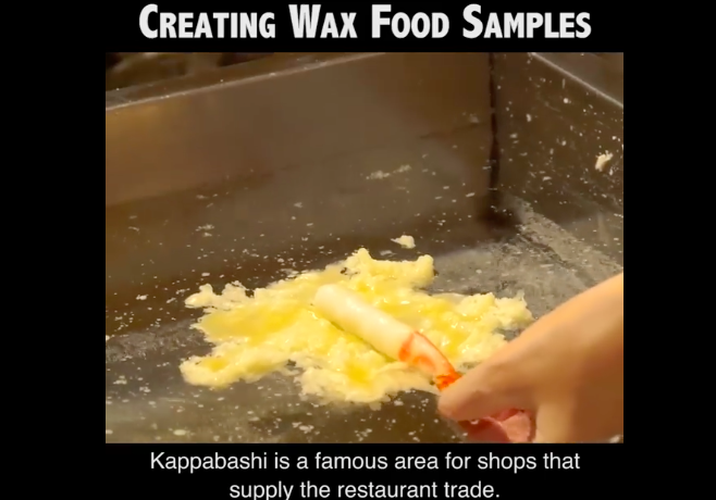 天ぷらを作るためには、コーティングするように温かいお湯の中に色付けされたワックスを垂らす。そして例えばエビなどのようにまた別に作られた食品形をゆっくりと水の中に浸して、コーティングを手で包むようにして成形する。