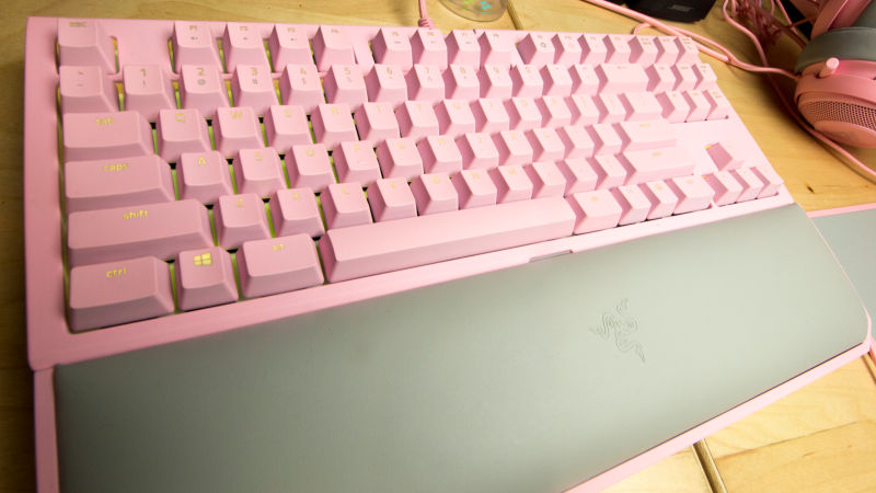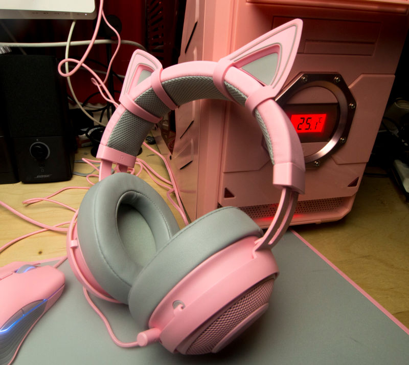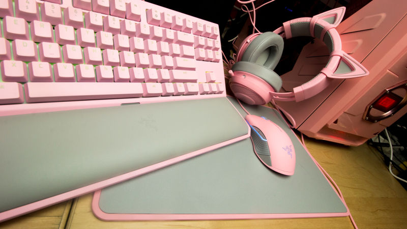 そのピンク色は柔らかく、明るく、陽気で友好的です。日に10時間から12時間PCの前に座って書いたり、遊んだり、お菓子を食べたりしている時に、僕が感じたいのは幸せです。去年、僕は比較的安いピンクのデスクトップケースを買いました。それはとても良い感じでした。2017年の間、ピンクのキーボードを作りました。それも良い感じでした。Razerのクウォーツラインも、これもまた良い感じで、更にはヘッドセットには猫耳が付いていました。尚良し、です。クウォーツラインは、今年リリースされた白やガンメタルのラインとほぼ同じもので、色だけが違うのです。