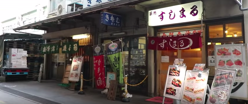 築地は、日本の観光客の主要目的地の1つです。築地市場には2つの場所があります。1つは、場内。ここでは元々の市場がある場所で、魚がせりにかけられ、売られています。そして、僕が今立っているここは場外。ここでは魚が旅行者や一般客向けに売られています。場内には、たくさんの素晴らしいレストランがあります。そして、午後3時にはほとんどのお店が閉店します。それは場外も同じなので、ここへ来るのは早めの時間がいいでしょう。