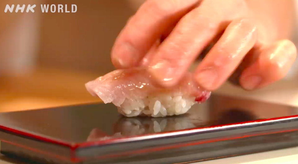 冬の季節、山口が好む特別な寿司があります。熟成カンパチです。彼は、すべての血を取り除いてから、魚を15日間熟成させます。酸化した部分は取り除きます。そして、最も美味しい部分を寿司として使います。これを食べたお客さんは、”もう、びっくり。熟成なので臭みを想像していたけれど、それが全くない”と話しました。