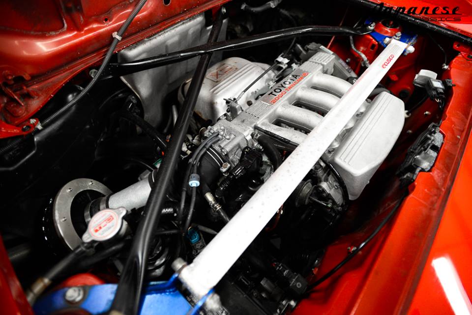 メカニカル部分でも、いくつかの素敵な改造をしています。2リッター、3S-GEエンジンがパワーの源です。HKSインテークとHKSハイパワーキャットバックマフラーにより、この自然吸気エンジンが雄叫びをあげるのです。最初のトーンはアグレッシブで、アクセルを踏み込むに音はどんどんよくなります。