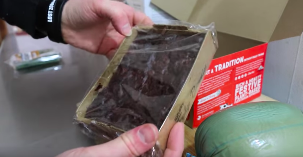 それではローストを作っていきましょう。箱を開けると、トーフーキーがパウチされて入っています。他にグレービーソースとブラウニーにクーポンまで入っていました。