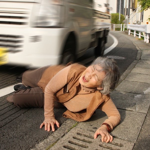 西本さんは自分の世代に起こっていることを風刺するかのように車道に転んでみせたり、洗濯物に吊るされたりする様子を写真に収めています。